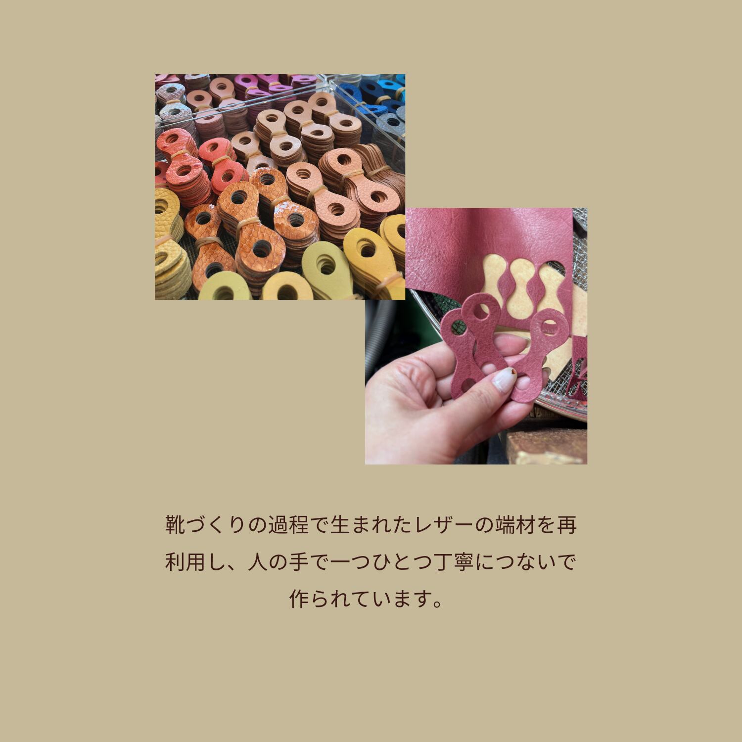 『L∞P STRAP』(レザーストラップ)は、靴づくりの過程で生まれたレザーの端材を再利用し、人の手で一つひとつ丁寧につないで作られています。