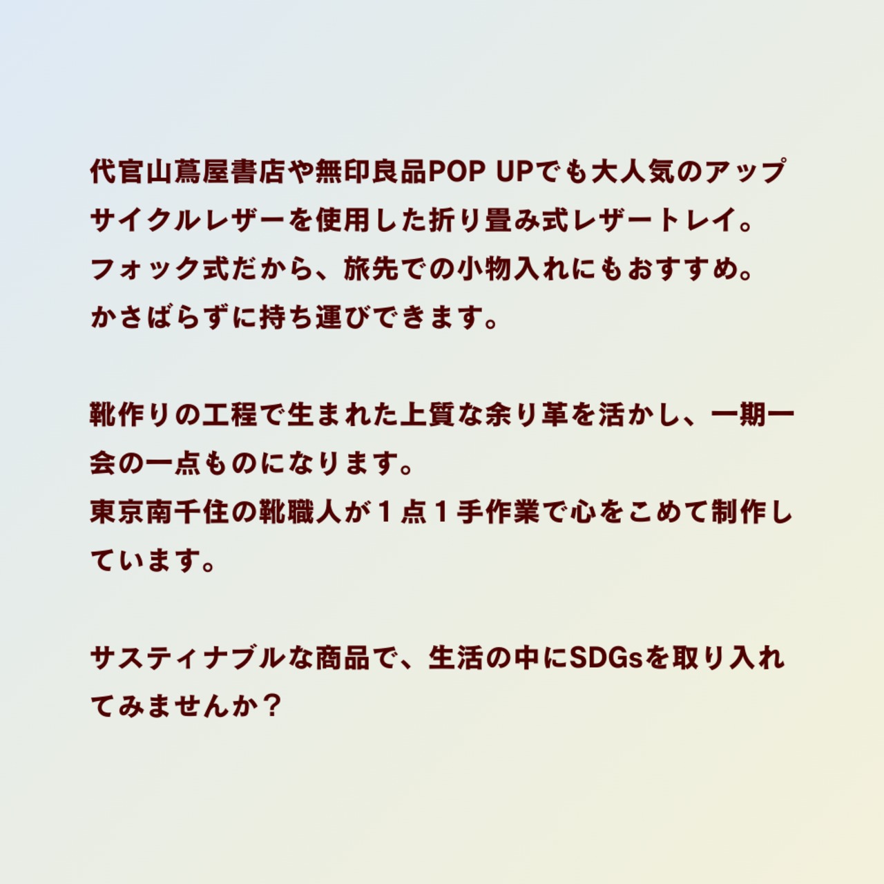 靴作りの工程で生まれた上質な余り革を活かし、一期一会の一点ものになります。